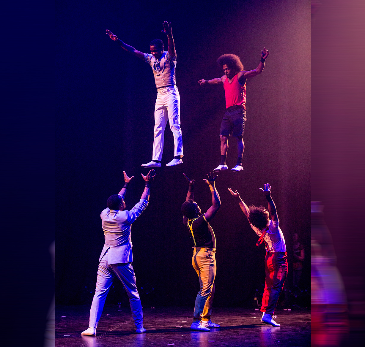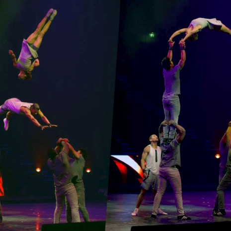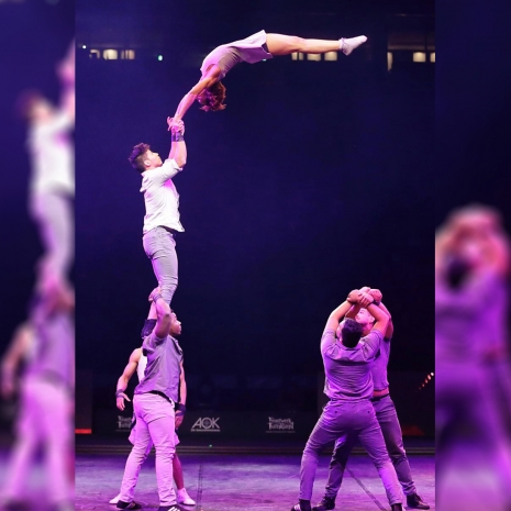 The banquine act showcases the amazing agility of the human body, is an acrobatic show with a group of minimum three people, with two or more bases and at least one flyer. The bases, or spotters, form a platform with their arms and hands interlocked which the flyer uses as a take-off position for somersaults and other aerial tricks.