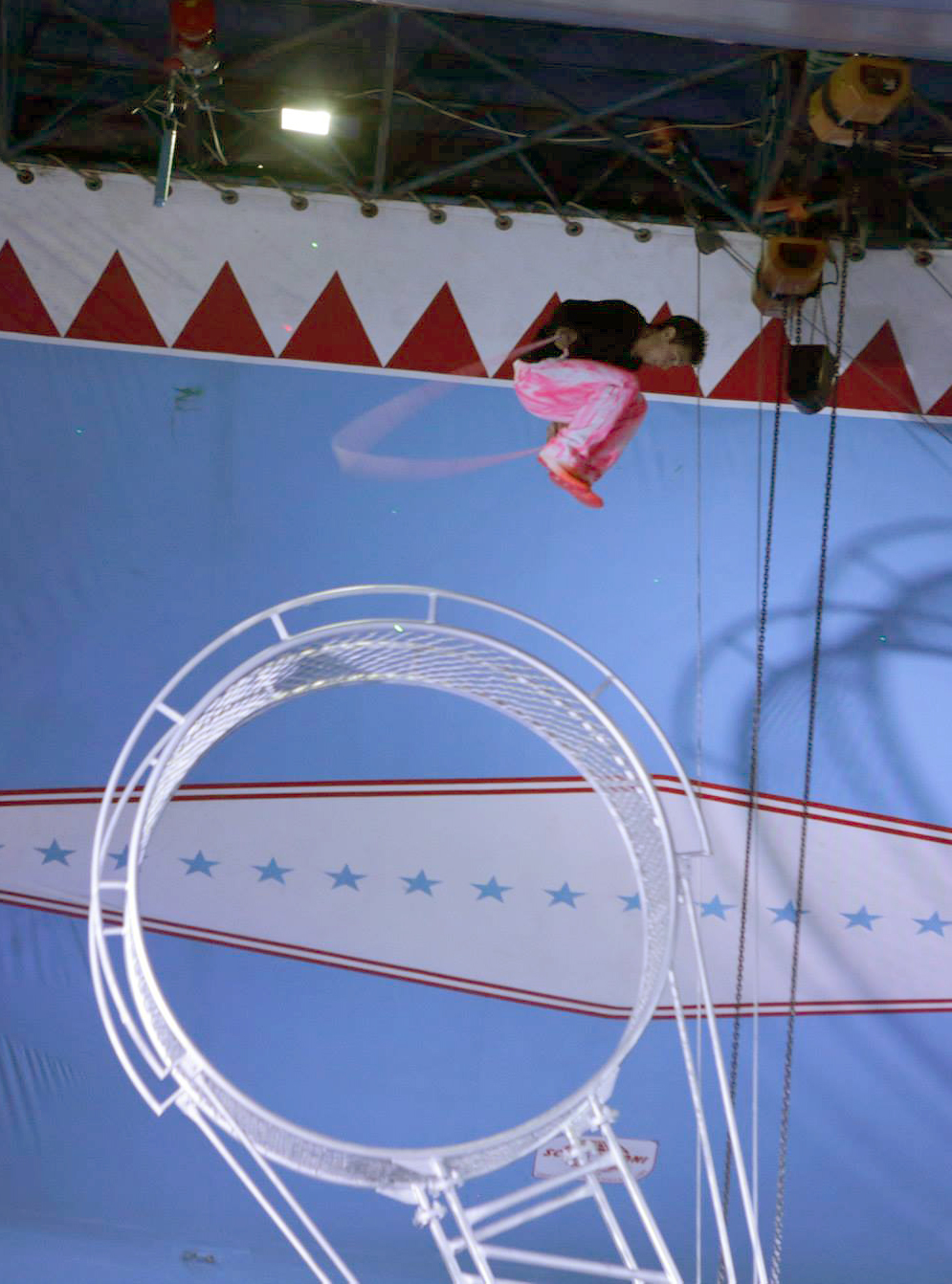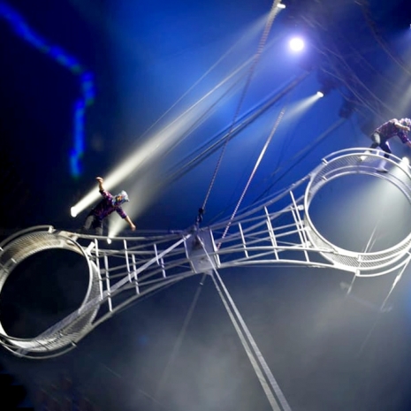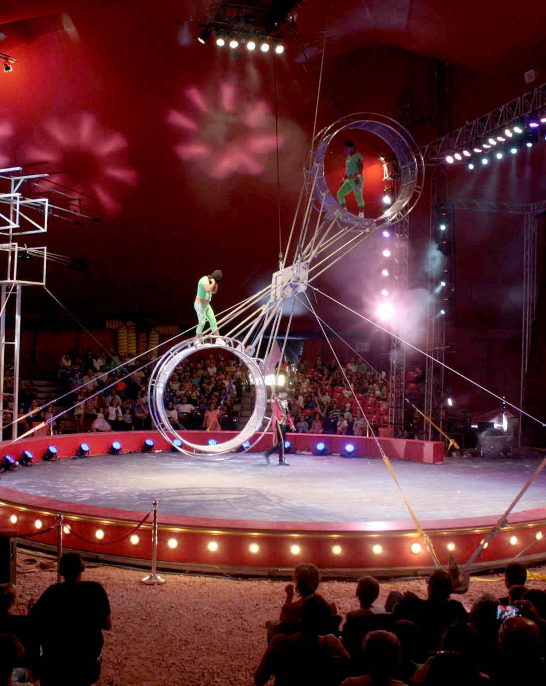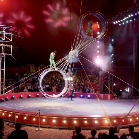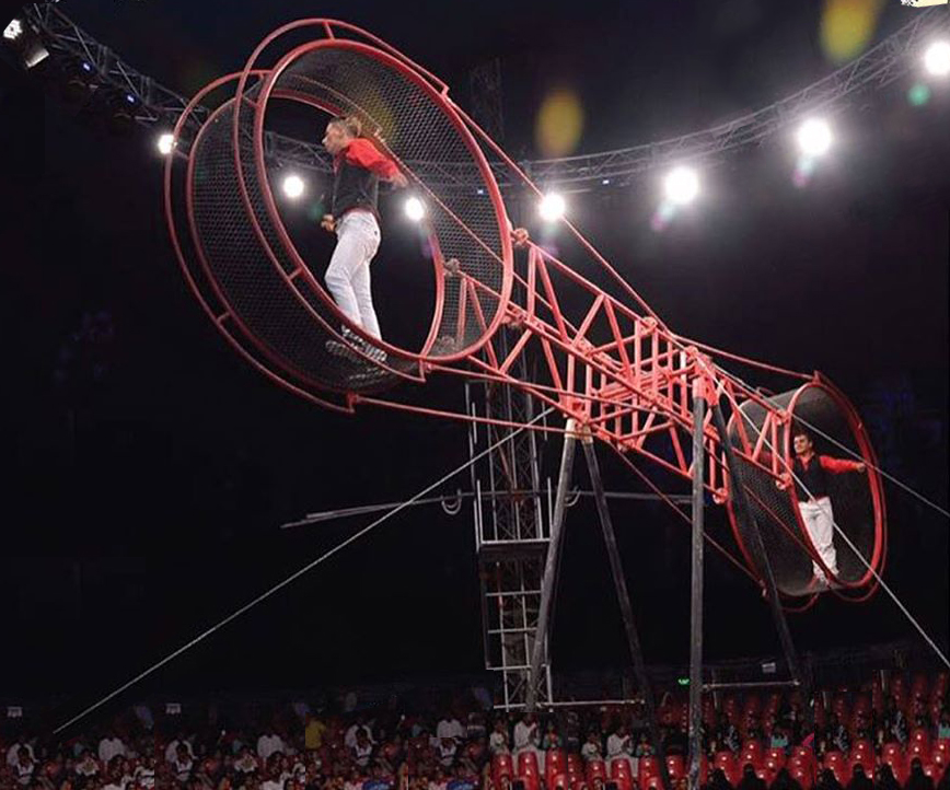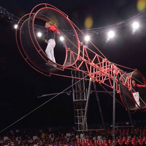 La rueda de la Muerte is one of the most dangerous and spectacular performances of the entertainment industry. The act features two or 4 people who perform high-risk feats atop and inside a pair of spinning wheels rotating high above the stage, artists must maintain balance as they navigate the rotating death trap harboring 8 diameter rings at either end, including jumps, rope skipping, running blind, and many more tricks.