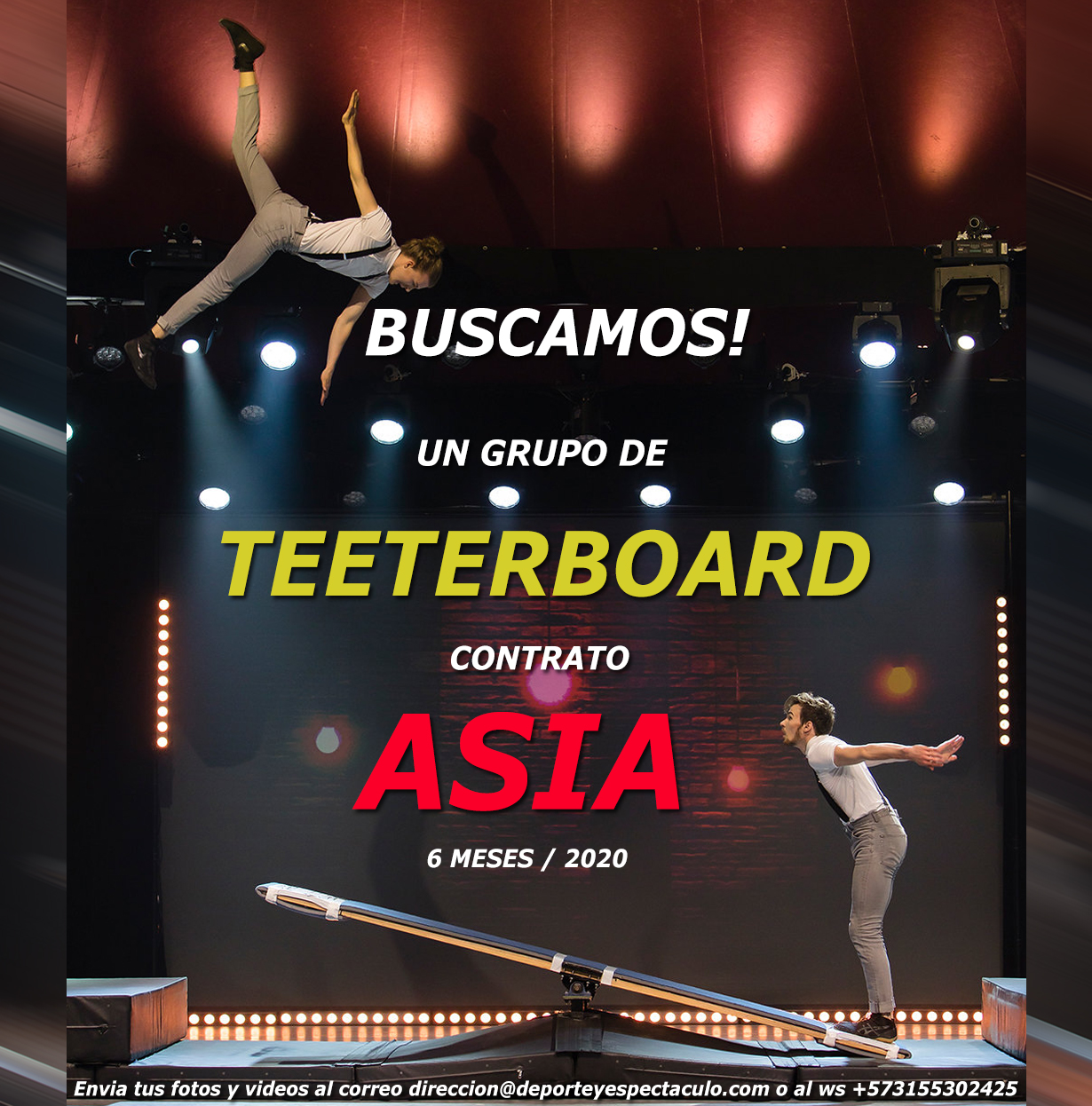 Siempre estamos buscando atletas y artistas excepcionales que tengan pasión por su oficio y el deseo de actuar, asi que si tienes habilidades extraordinarias y puedes demostrar agilidad superior, mucha fuerza y alegría, pero sobre todo mucho compromiso y honestidad, entonces esperamos saber de usted.
